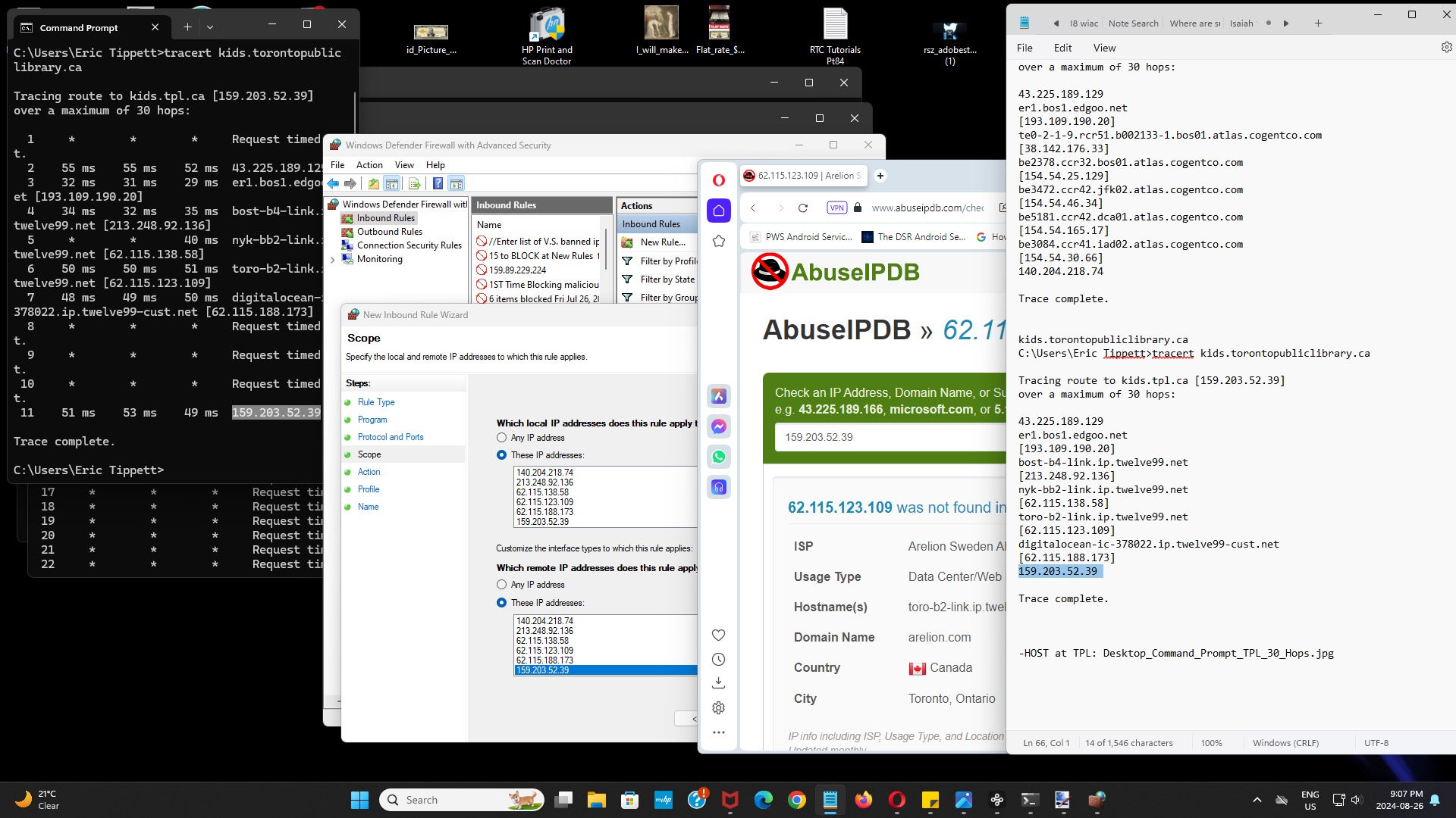 Two places to look up are at TCPVIEW and in Command Prompt. (To lock down malicious IPs please use New Rules (aka Windows Defender Firewall with Advanced Security) To Load up New Rules... Click in Search box, click on Command Prompt and type in:>wf.msc Click on left Panel 'Inbound Rules.' Click on right Panel 'New Rule... Click 'Custom' Pick, Next, All programs, Next, Block the connection, Next, Next again. Add Name and optional description, Click Finish, DONE! You have protected your Computer safely denying access to malware blocking incoming malicious IPs one at a time. To Load up TCP VIEW... Download to your Computer Desktop TCPView for Windows - Sysinternals at: https://learn.microsoft.com/en-us/sysinternals/downloads/tcpview Click 'Download TCP View' (1.5 MB) On screen, click 'tcpview Application' to make changes. With all open online Windows closed and so whose IP's are left scan as suspicious, scum floats. The General Security Malware Reports HTML Page, https://spywaresecurity.ca/index.html is not overlooked, with an S for security is included as a Redirect to the URL Address, https://spywaresecurity.ca/index.shtml with the second s in the URL, it providing Protection in the 2 Security Scripts onboard written in the HTML Source code. |